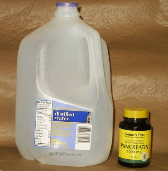 Since the cat was unable to eat or drink, the first objective was to provide liquid to prevent dehydration. The second objective was of coarse to cure the cat of possible cancer. Having read The Enzyme Treatment of Cancer and Its Scientific Basis by John Beard, D.Sc. and other alternative cancer treatment books since both my wife and my brother died of cancer, I decided to treat the cat with pancreatic enzymes. I am not a doctor, but in June 2007 I will graduate from college with a B.S. degree in Chemistry and Biology.